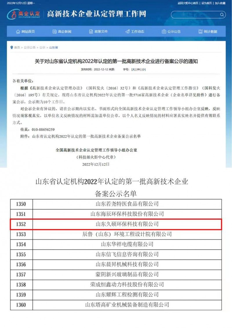山東久碩環(huán)??萍加邢薰?,成功申請成為高新技術企業(yè)